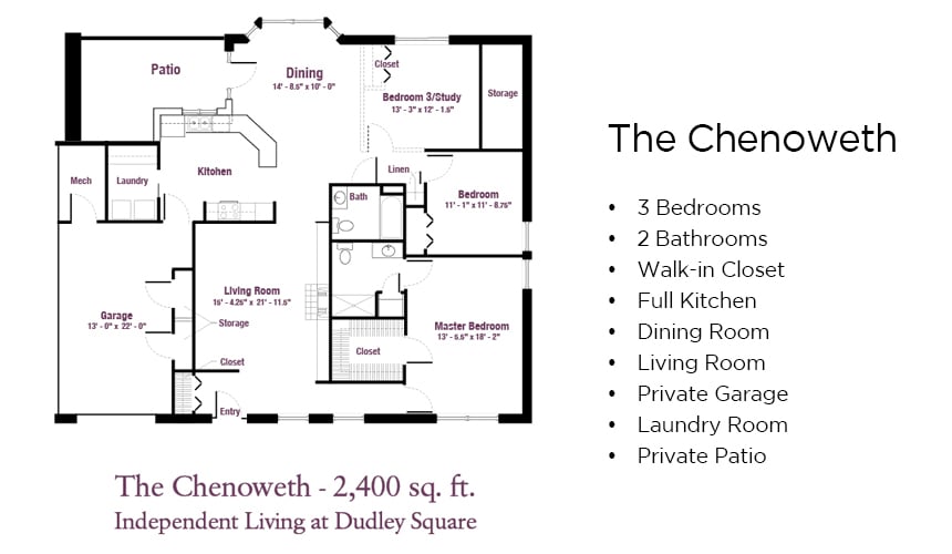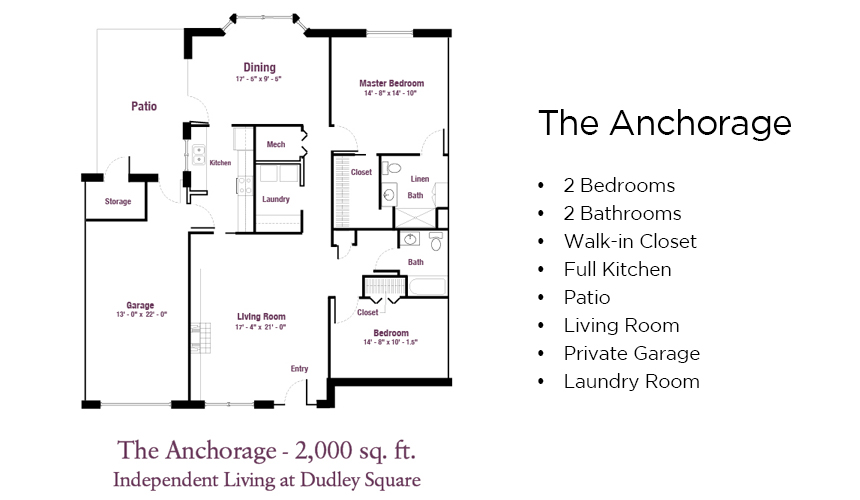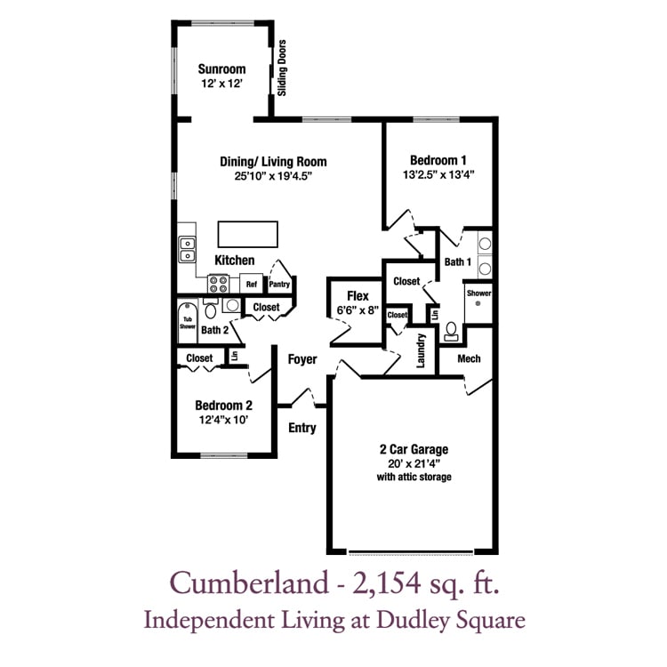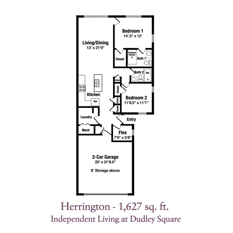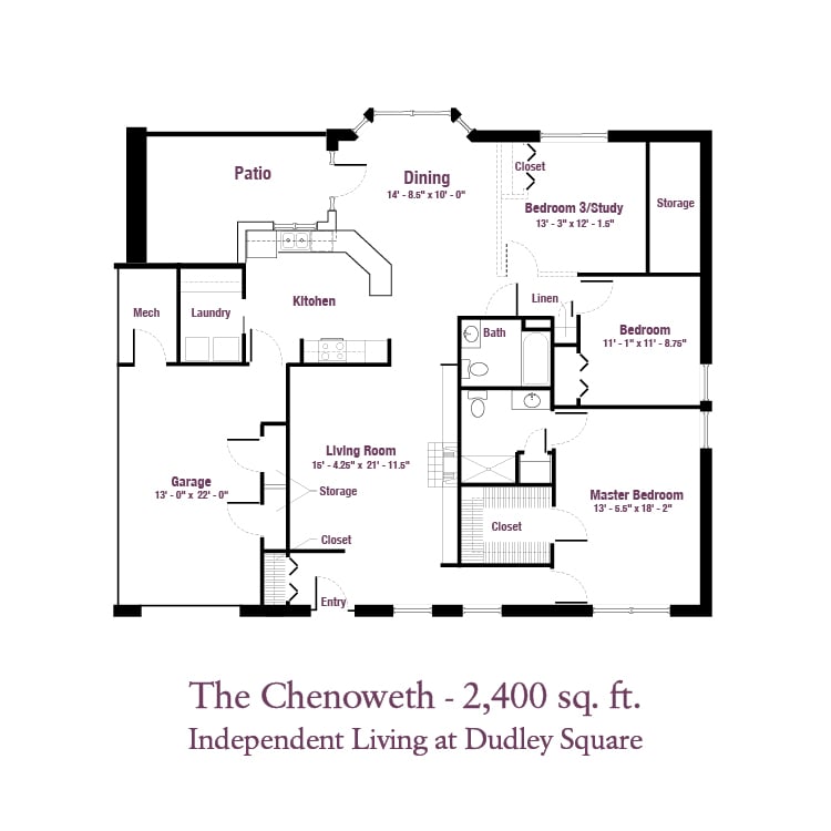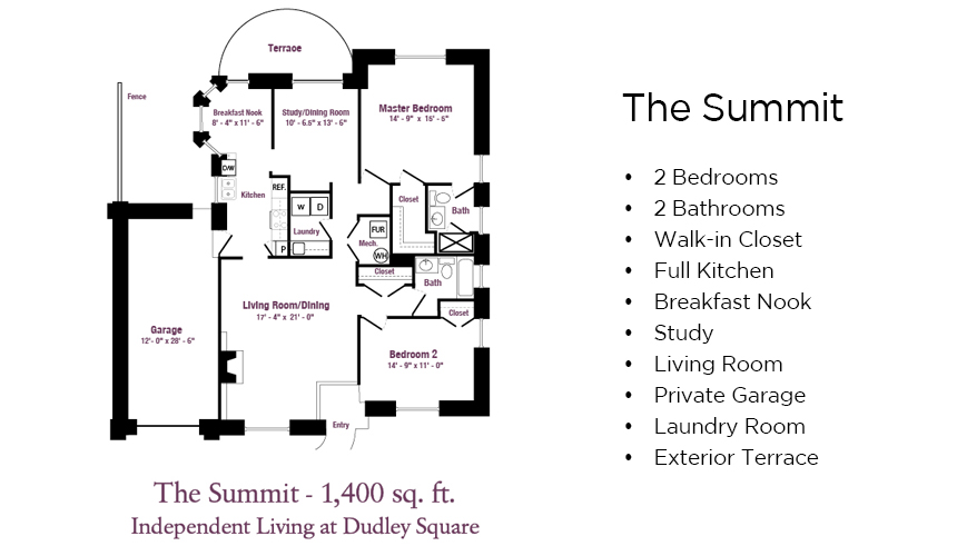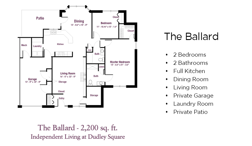 Independent Living at Dudley Square offers comfortable independent senior living on your terms. Select one of eight available floor plans — ranging from 1,100 to 2,400 square feet. All apartments are equipped with universal design features and an emergency response alarm system. Each home has an entrance, garage, rear patio (or screened porch), adequate storage and utility room, as well as a host of standard and optional amenities. Most independent living floor plans at Dudley Square offer two or more bedrooms and are part of the community that received the Best Nursing Home Choice Award in 2025. Entrance fees start in the range of $253,000, and monthly fees start at around $1,315.